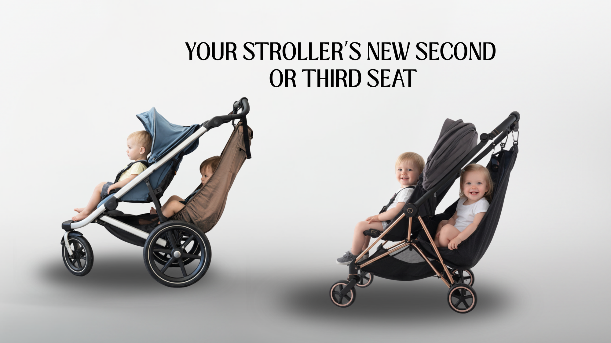 Meet The Stroller Sling™, the first-of-its-kind stroller hammock that safely secures to most single and double strollers— adding a second or third seat in seconds!