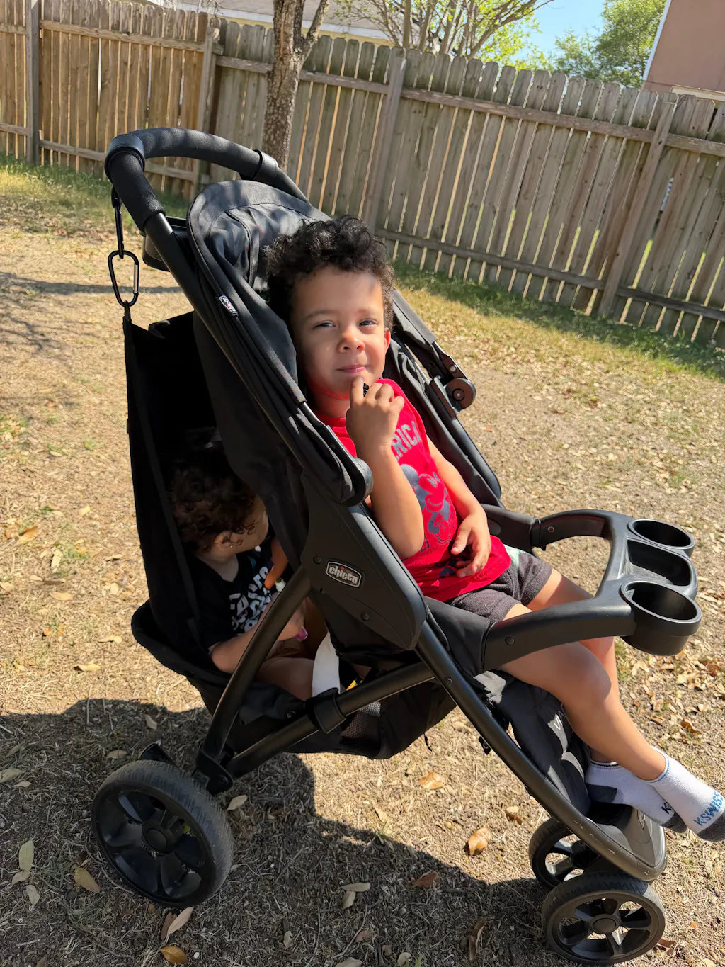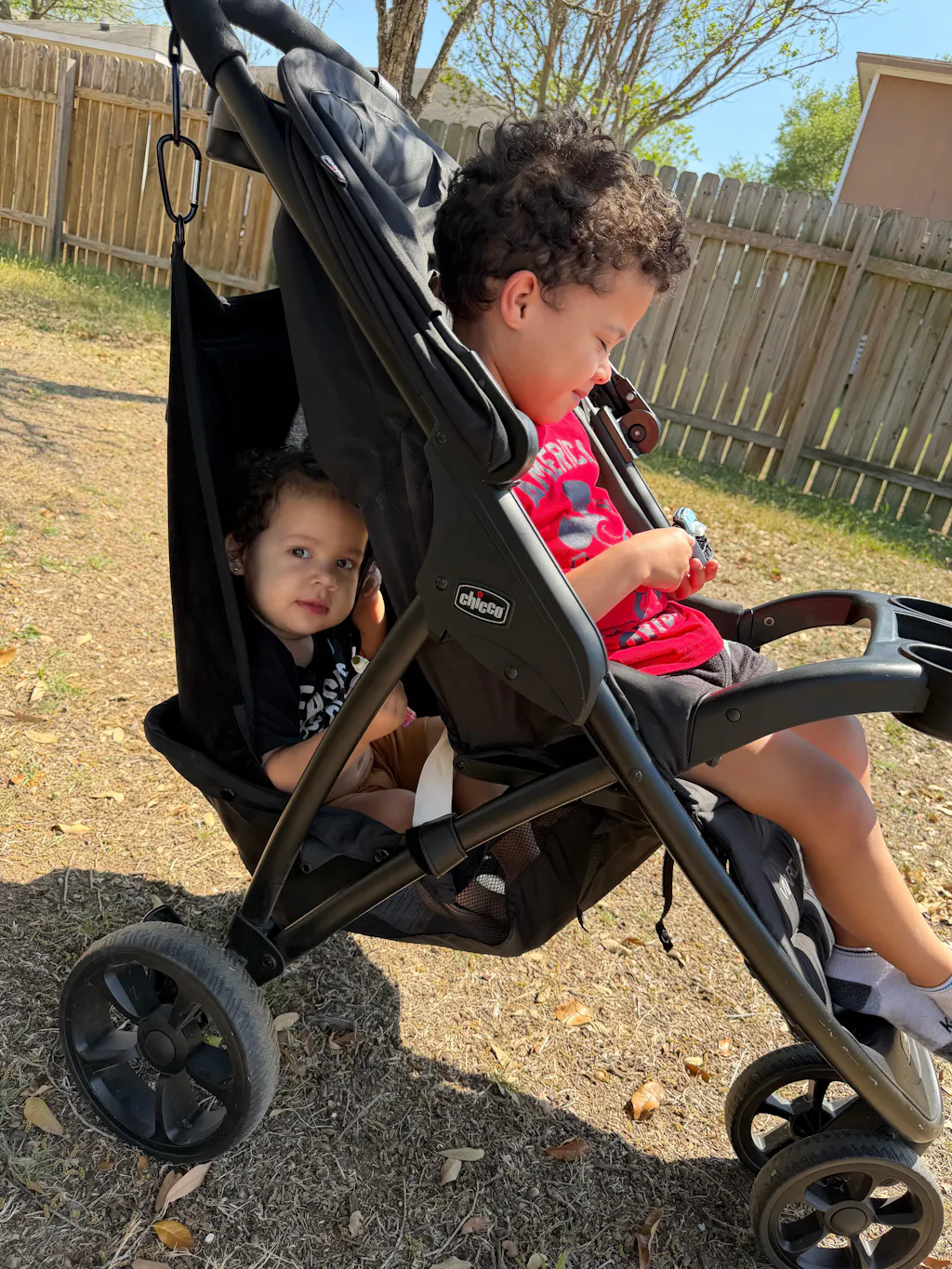 have three boys (5, 3, and 1) and live in the city, so getting out the door used to feel like a whole production—especially trying to manage a double stroller everywhere. This stroller sling has honestly made things so much easier. I can keep my older boys in the stroller while wearing my baby comfortably on my back, and it’s been a game changer for walks, errands, and everyday life.