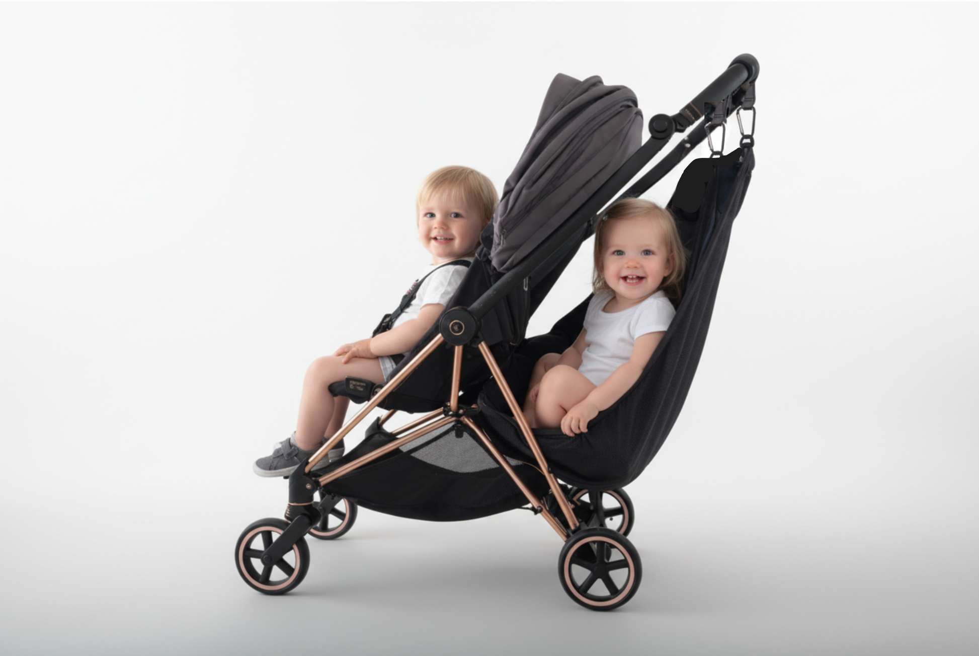 The Stroller Sling™ is the original hammock-style stroller seat add-on that instantly creates an extra space for your child. It attaches in under a minute with reinforced straps and stroller hooks, transforming the stroller you already own into a double — or even triple — stroller solution without the cost or bulk of buying another stroller.
