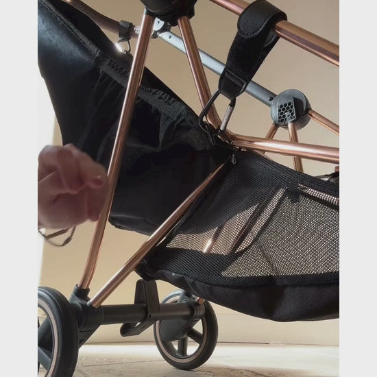 The Stroller Sling™ "Black Fox" edition adds a new color-way, and additional convenience features to our classic stroller hammock, such as a new roll-up feature that allows the sling to fold into itself and stay hooked on the handlebar at all times.